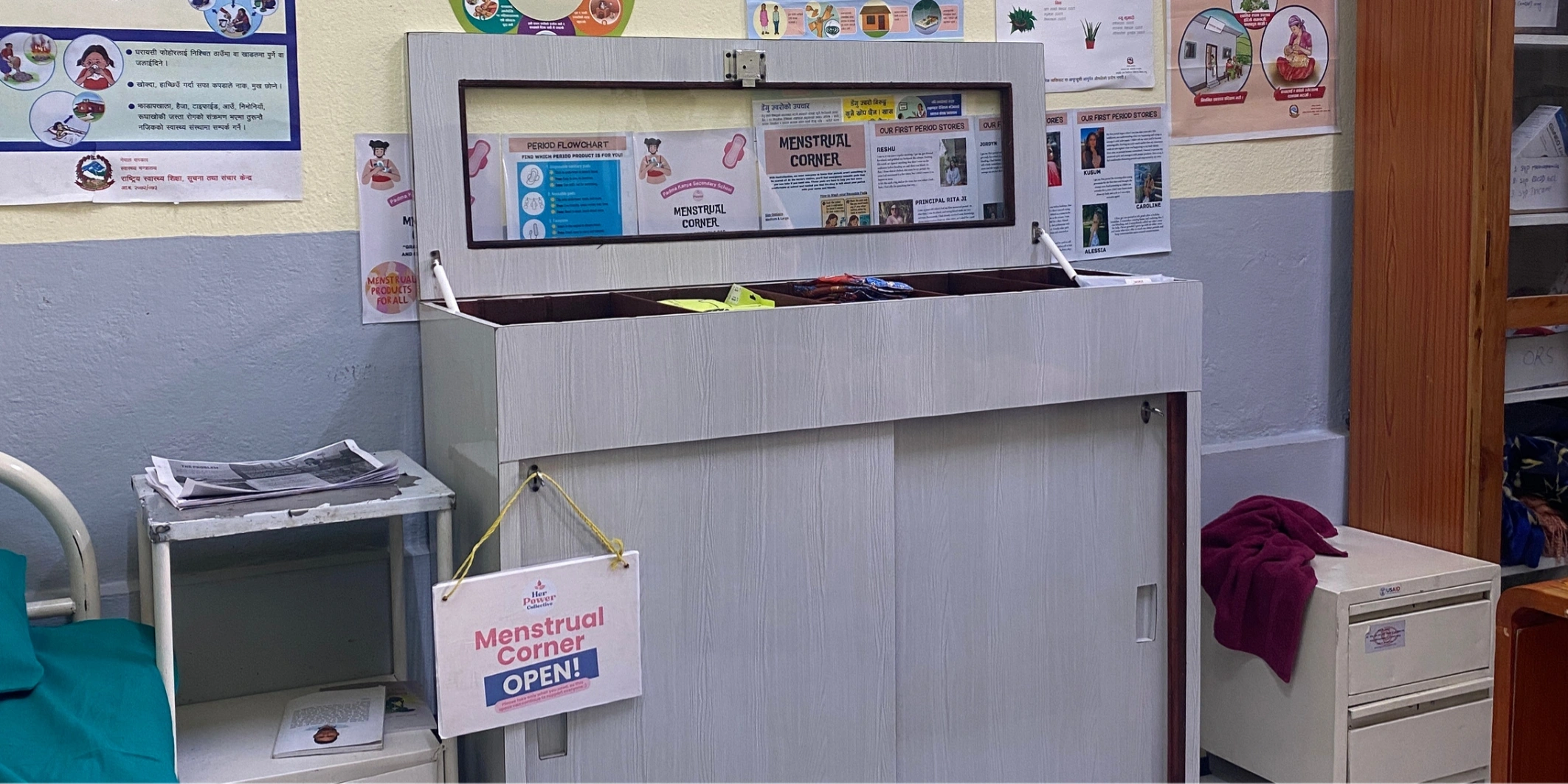 The menstrual corner provides: emergency menstrual pads basic hygiene supplies educational materials about menstrual health a safe and private space for girls to manage their periods