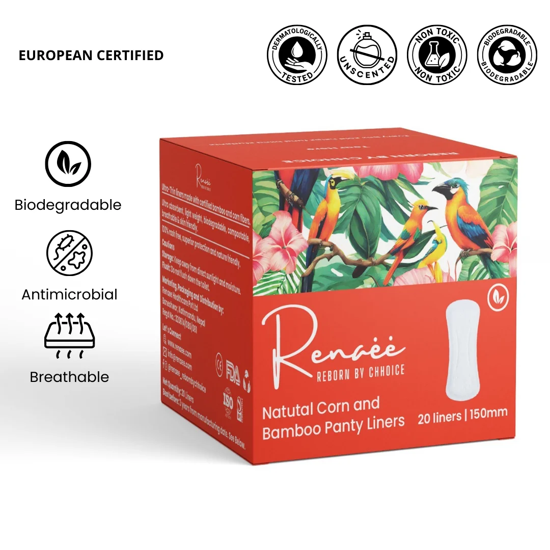 Enjoy daily freshness and light protection with Renaee panty liners. Our soft, breathable design ensures all-day comfort. Ideal for spotting, daily discharge, or as tampon backup, these ultra-thin, flexible, and discreet liners are made with a natural bamboo fiber top sheet, gentle on even sensitive skin. They offer reliable leak protection, keeping you fresh and confident daily. Each liner measures 150mm.